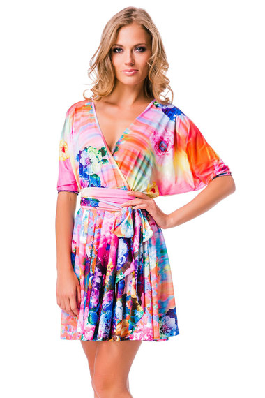 ОписаниеЯркое летнее платье из струящейся микрофибры в розовых тонах. Модель с расклешенной юбкой и рукавами "летучая мышь".