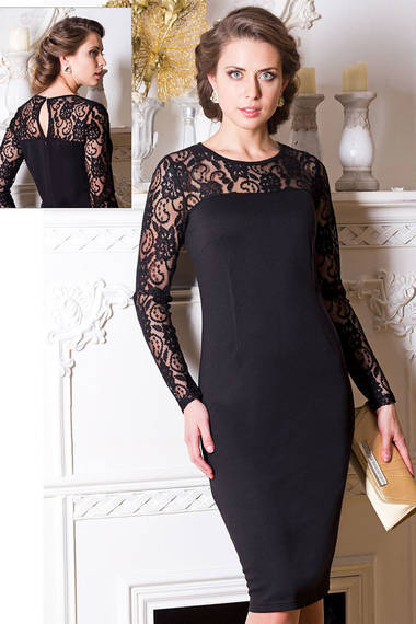 Черное облегающее платье-футляр черного цвета. Рукава и верх платья выполнены из черного гипюра, сзади застегивается на потайную молнию и небольшую пуговку с вырезом "капелька".