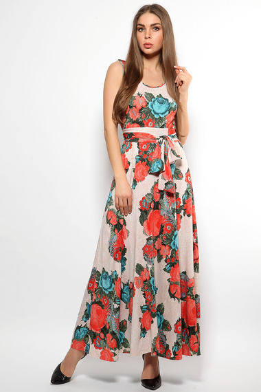 Блинное платье без рукавов, с длинным поясом в тон изделия. Выполнено из струящейся микрофибры с цветочным принтом.