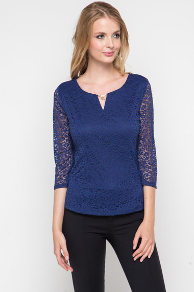Обворожительная блузка из ажурной синей ткани цвета ночного неба. Модель с рукавами 3/4, застежкой на молнию сбоку и красивой фурнитурой на горловине.