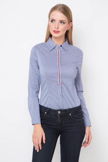 Стильная блузка-боди из хлопковой ткани в синюю клетку. Модель с синими кружевными трусиками на крючках. Блузка оделана контрастной строчкой на передней планке. Боди прекрасно сочетается как с юбкой, так и с брюками.